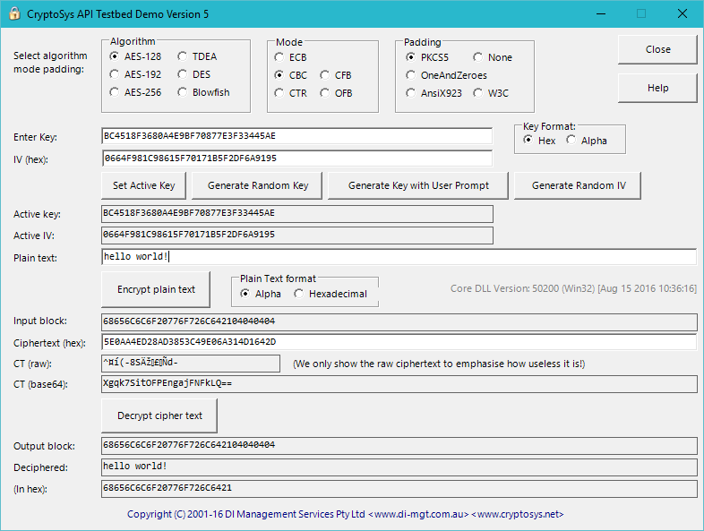CryptoSys API. Use this to experiment with different combinations of encryption algorithms, block cipher modes, padding, hex and alpha input, and more.